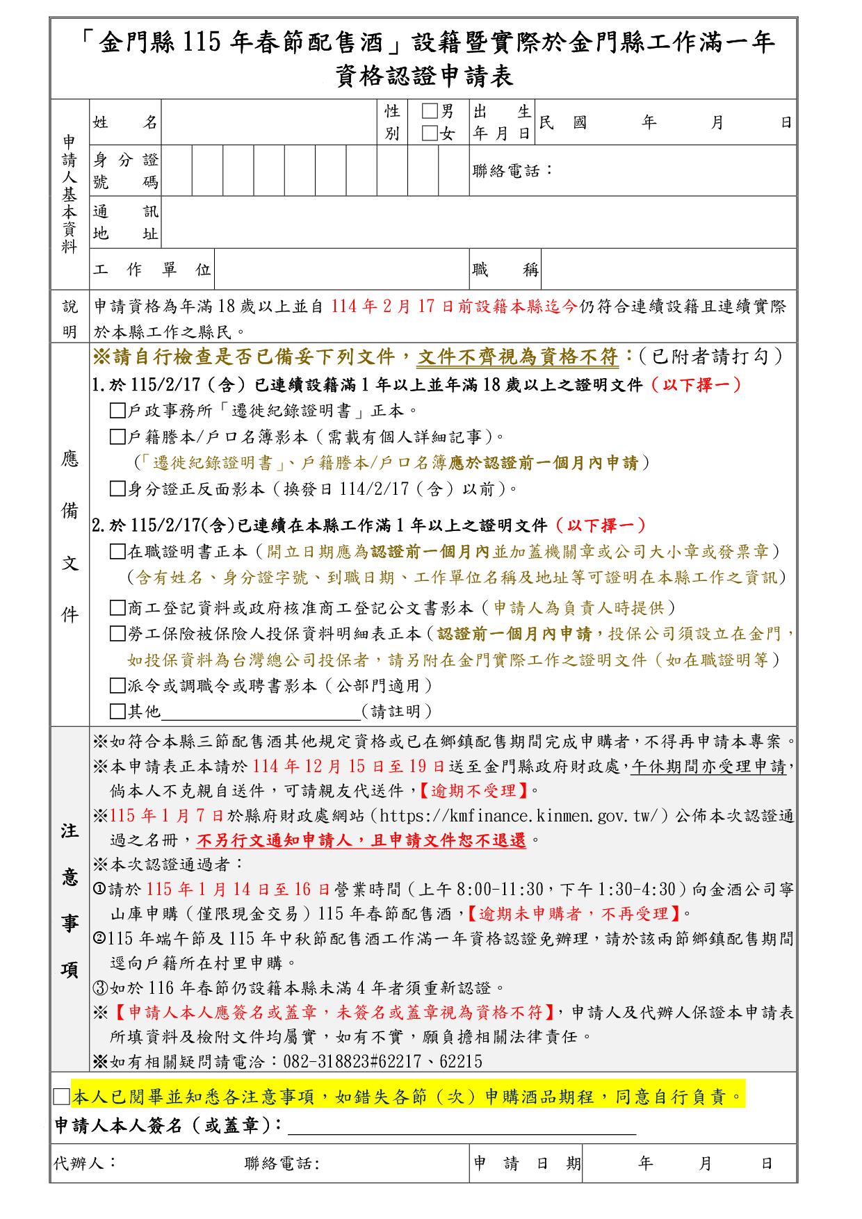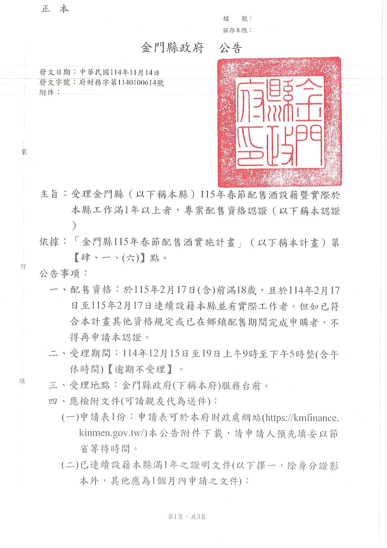 公告受理「金門縣115年春節配售酒」設籍本縣且實際於本縣工作滿1年以上者,專案配售資格認證